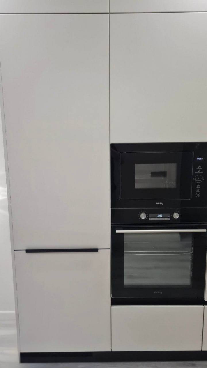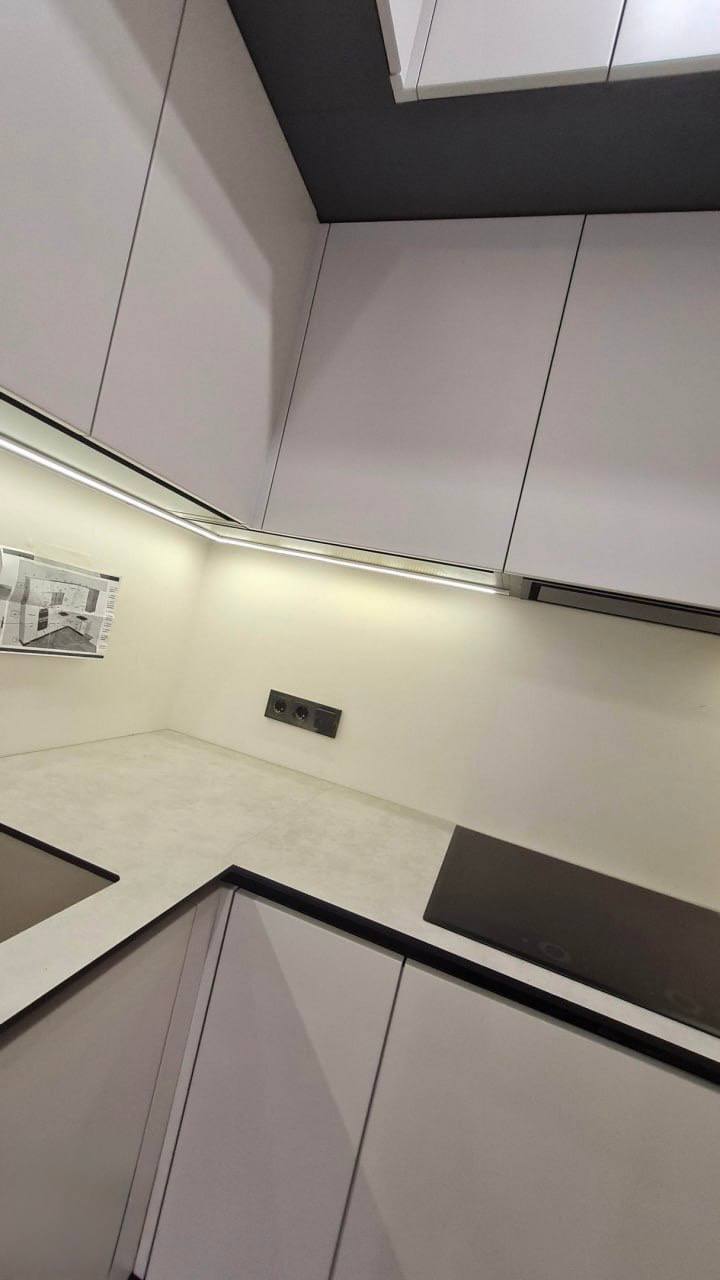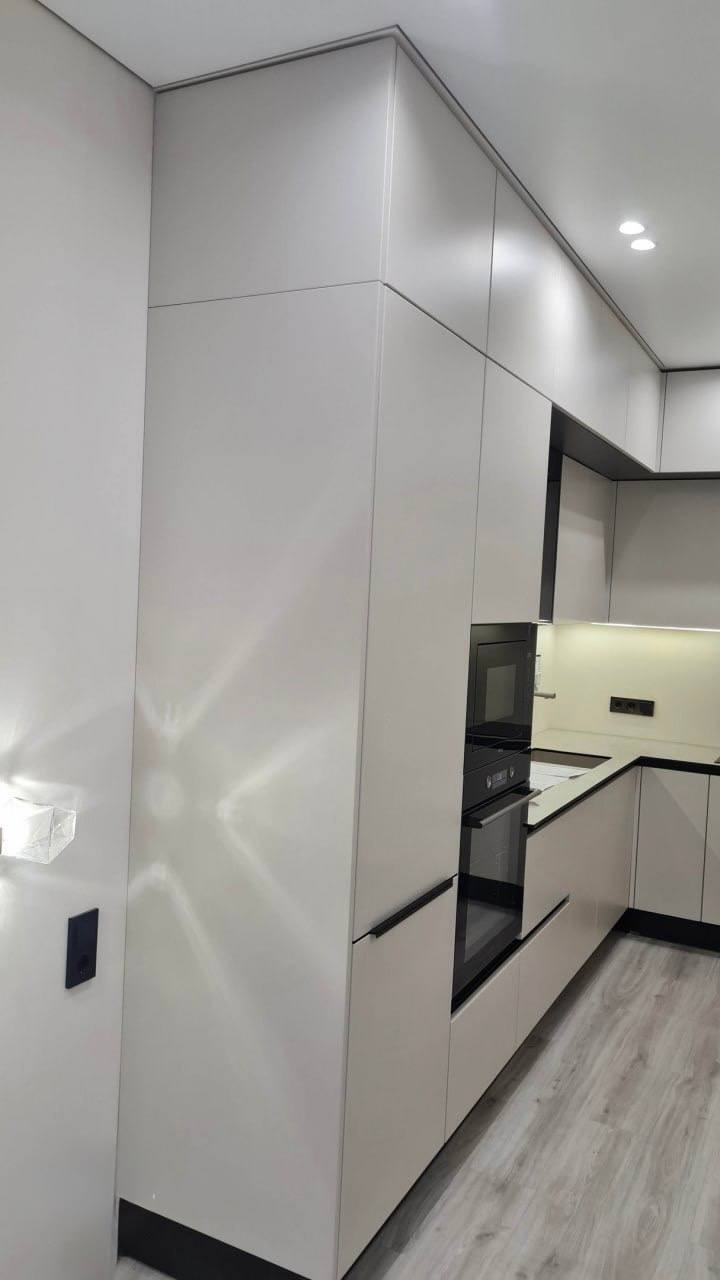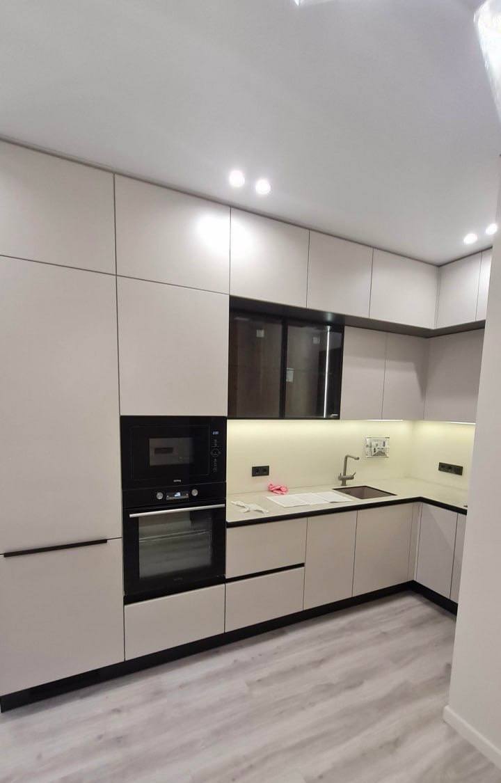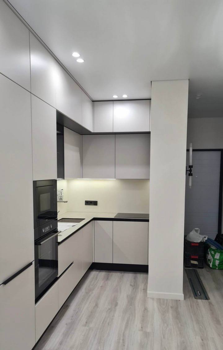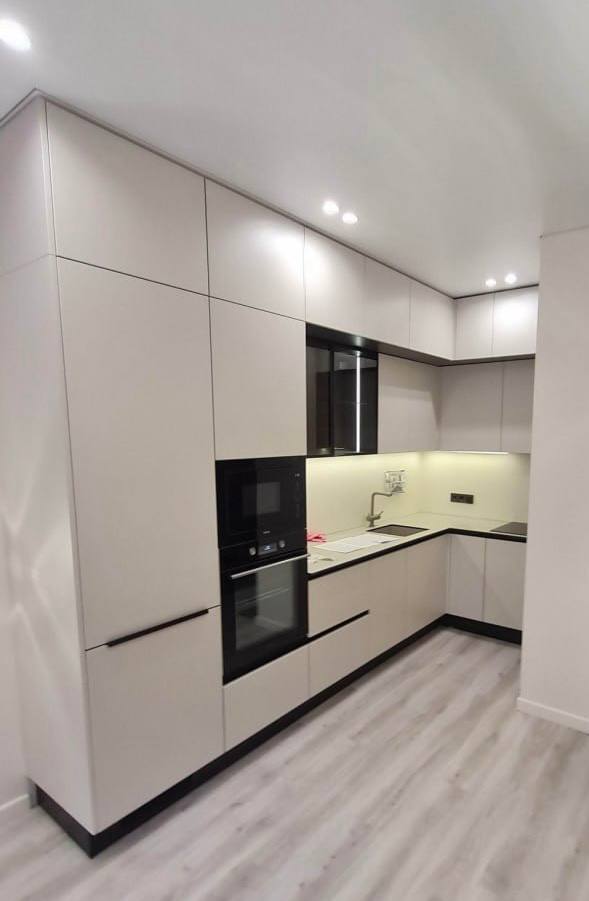 Эта современная угловая кухня сочетает в себе надежность и элегантность. Корпус выполнен из качественного ЛДСП Kronospan толщиной 16 мм, а фасады изготовлены из МДФ 19 мм с пленочным покрытием, что обеспечивает привлекательный внешний вид и легкость ухода. В конструкции предусмотрены стеклянные вставки в алюминиевом профиле, добавляющие визуальной легкости и стиля. Столешница из компакт-пластика HPL толщиной 12 мм с еврозапилом устойчива к влаге, царапинам и термическим воздействиям. Немецкая фурнитура Hettich с доводчиками обеспечивает плавное и бесшумное открывание дверей и ящиков, а профильные ручки Gola и черные торцевые ручки придают кухне современный и аккуратный вид. В комплект входят цокольная планка из пластика, подъёмные механизмы и аксессуары Kessebohmer для удобства использования. Возможна установка дополнительных элементов — сушки для посуды, лотка для столовых приборов и LED-подсветки. Эта кухня станет функциональным и стильным решением для вашего дома.