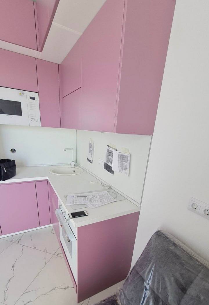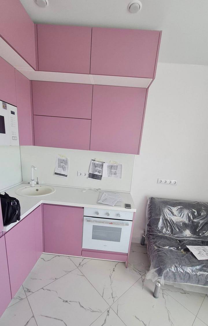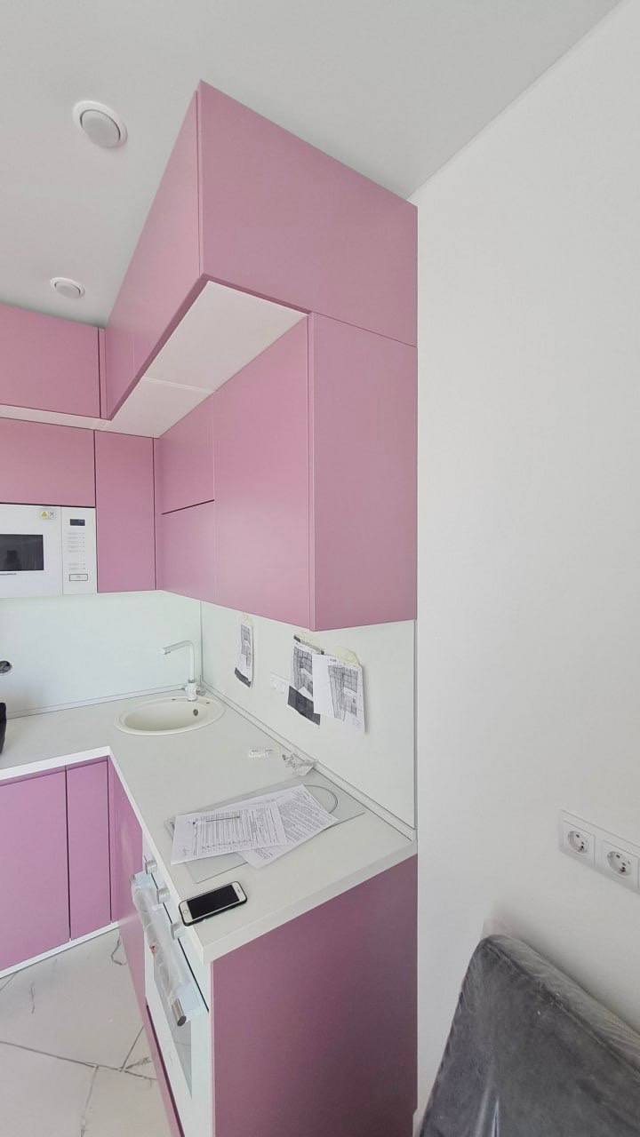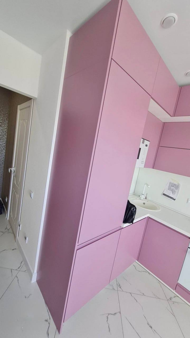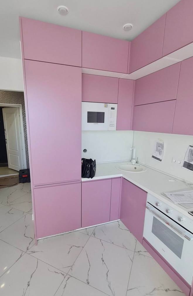 Эта кухня сочетает в себе выразительный розовый цвет матовой эмали и высокое качество материалов. Корпус выполнен из ЛДСП Kronospan толщиной 16 мм, а фасады — из МДФ 19 мм с матовым покрытием, устойчивым к механическим повреждениям и выцветанию. Столешница из влагостойкого HPL толщиной 38-40 мм обеспечивает надежность и легкость в уходе. Фартук представлен стеновой панелью, защищающей стены от загрязнений.